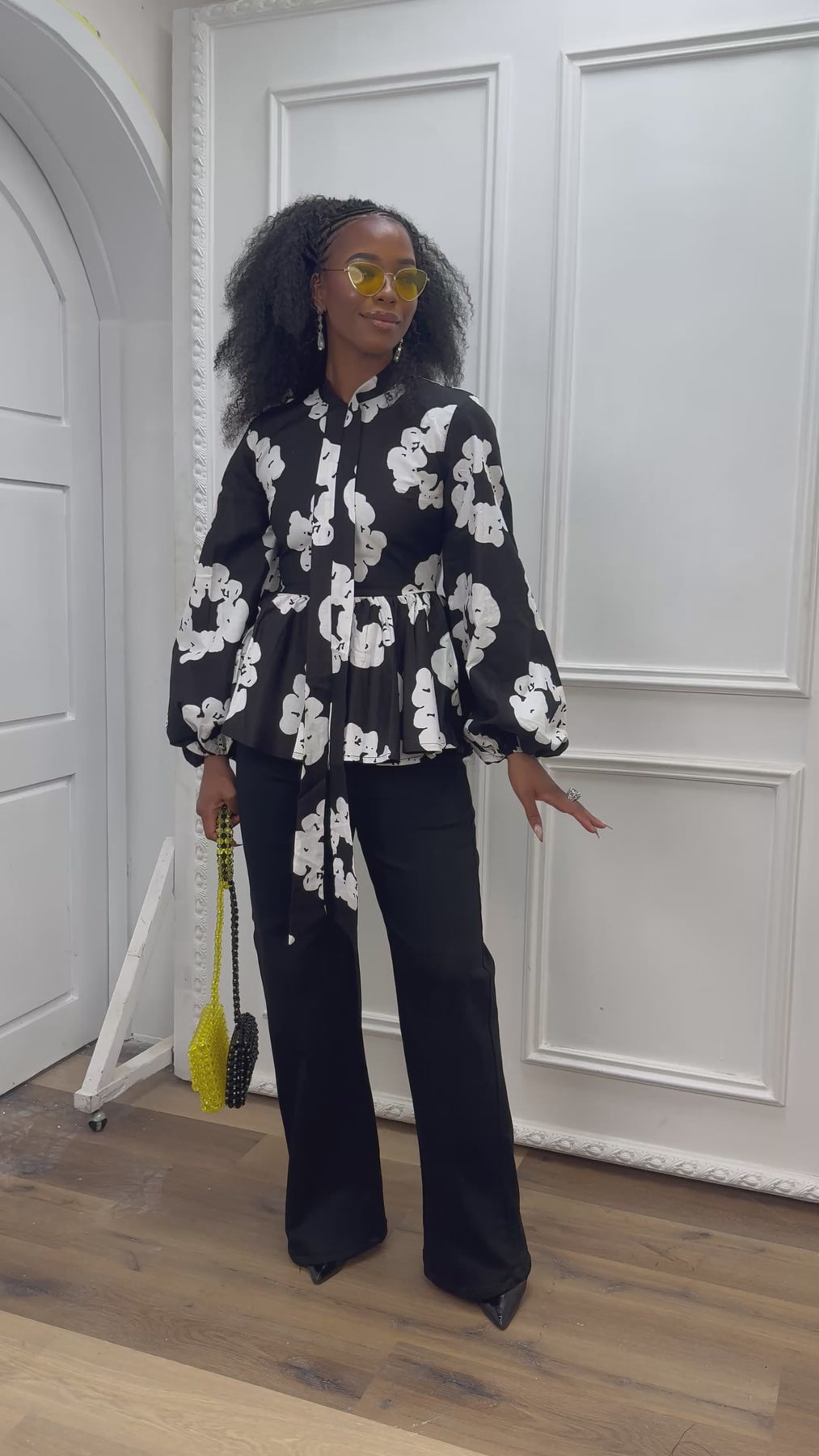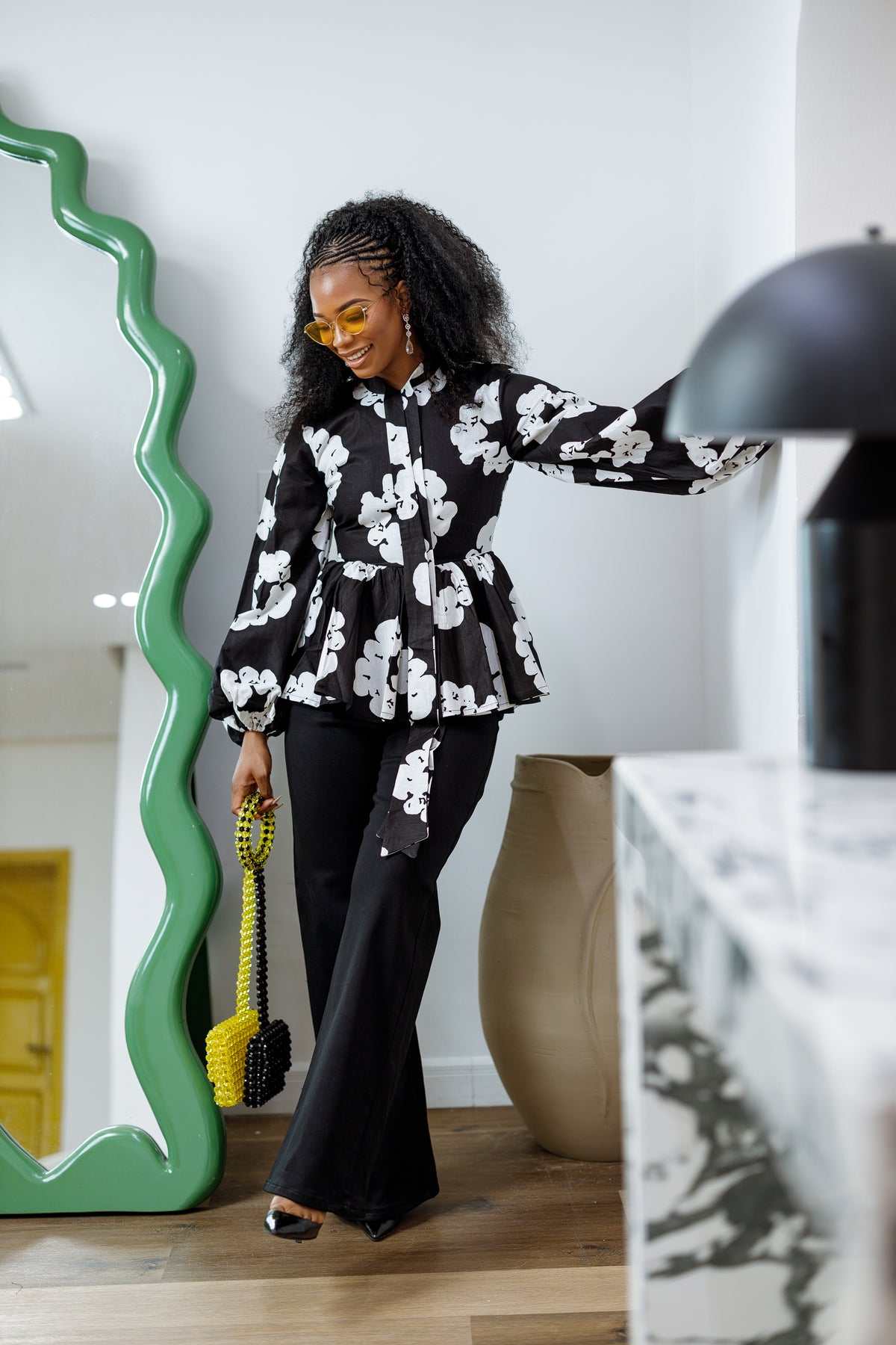 Bring bold elegance to your wardrobe with our African Print Tie-Neck Peplum Top, designed to make you feel every bit the Queen you are. Crafted from premium African wax cotton, this vibrant top features a flattering peplum silhouette, dramatic puff sleeves with elastic cuffs, and a stylish tie-neck bow that adds a sophisticated, feminine touch.