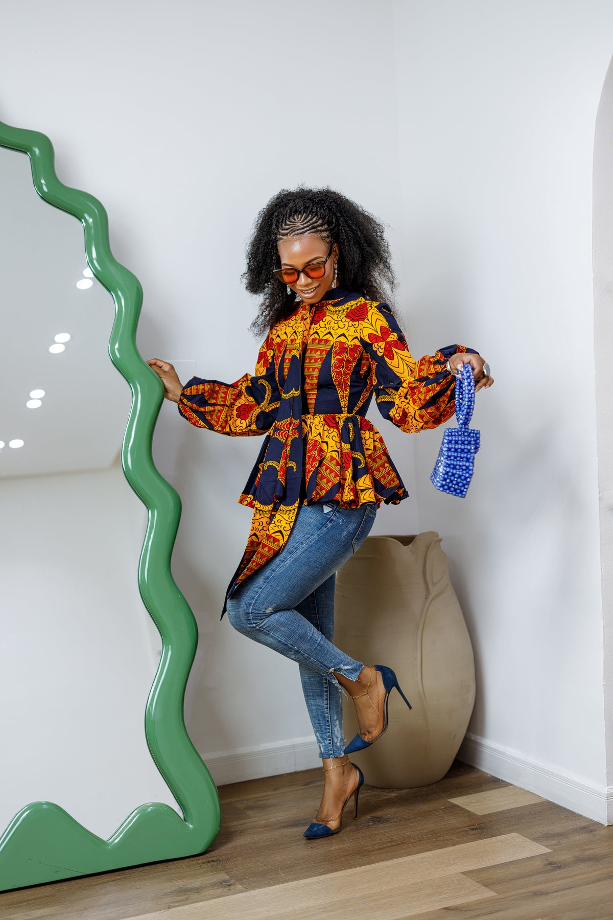 Bring bold elegance to your wardrobe with our African Print Tie-Neck Peplum Top, designed to make you feel every bit the Queen you are. Crafted from premium African wax cotton, this vibrant top features a flattering peplum silhouette, dramatic puff sleeves with elastic cuffs, and a stylish tie-neck bow that adds a sophisticated, feminine touch.
