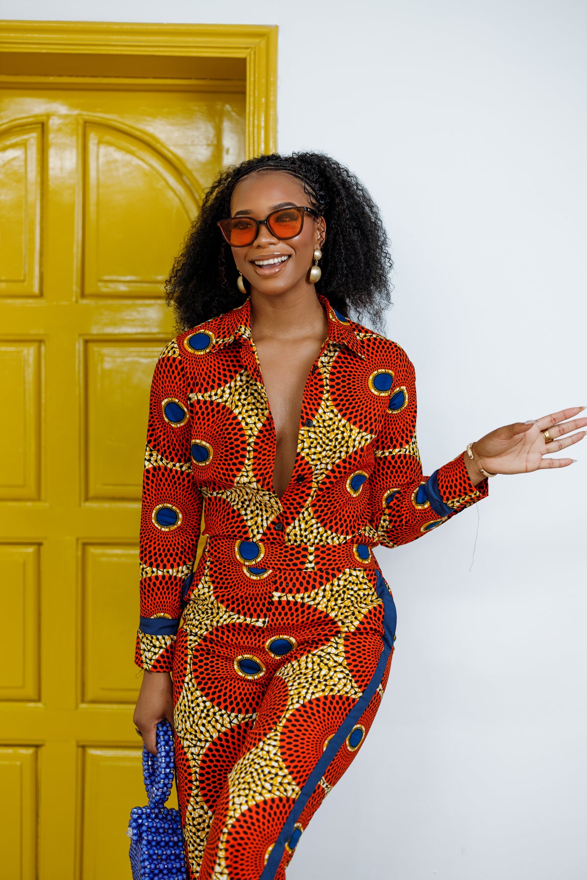 Turn heads effortlessly with our African Print Button-Down Pant Set, crafted from premium wax cotton for a bold, structured, and polished look. The set features a crisp button-down top paired with tailored straight-leg pants finished with contrast side paneling for a modern, elongated silhouette.