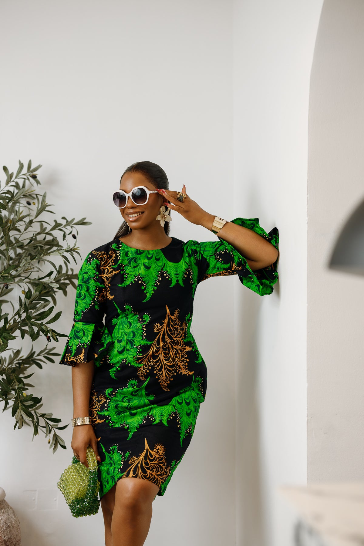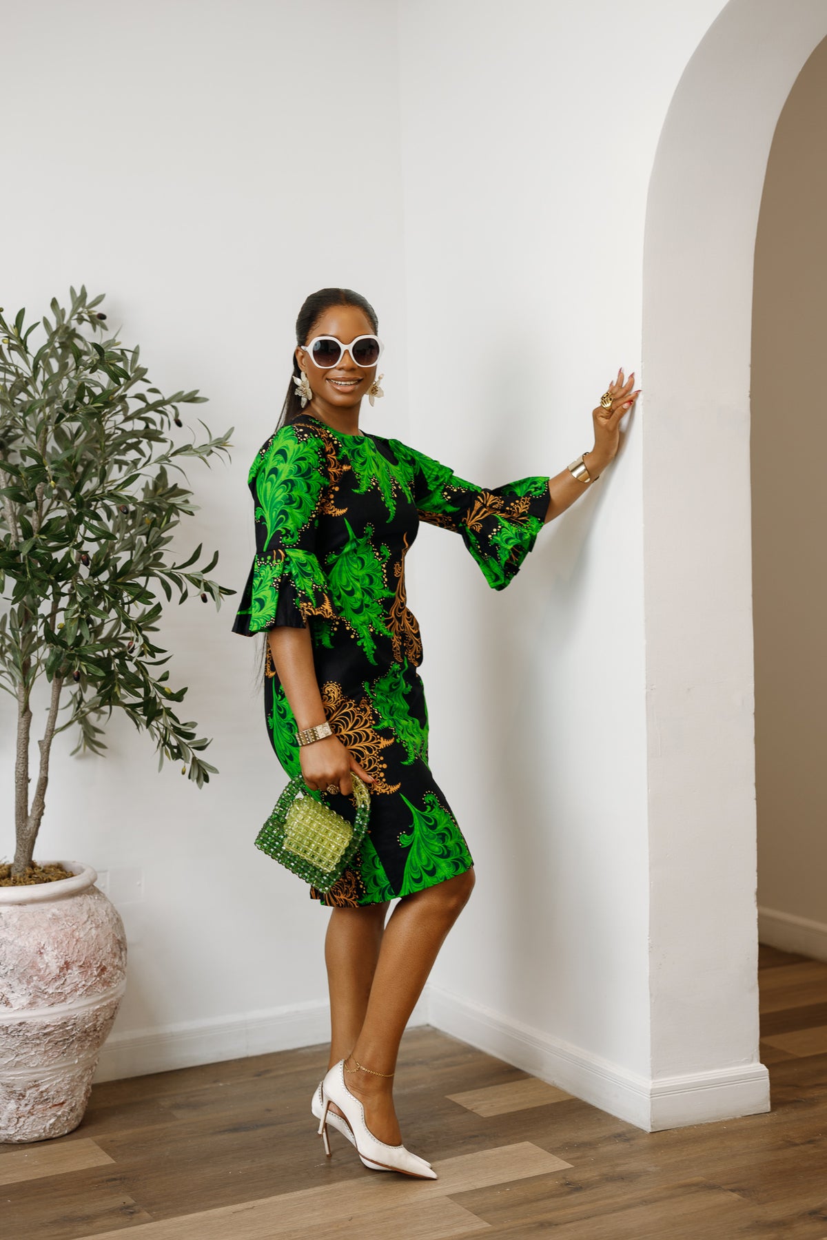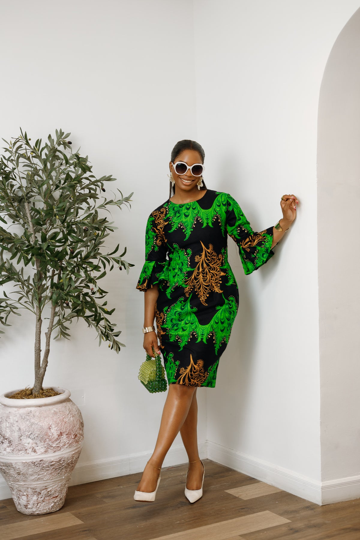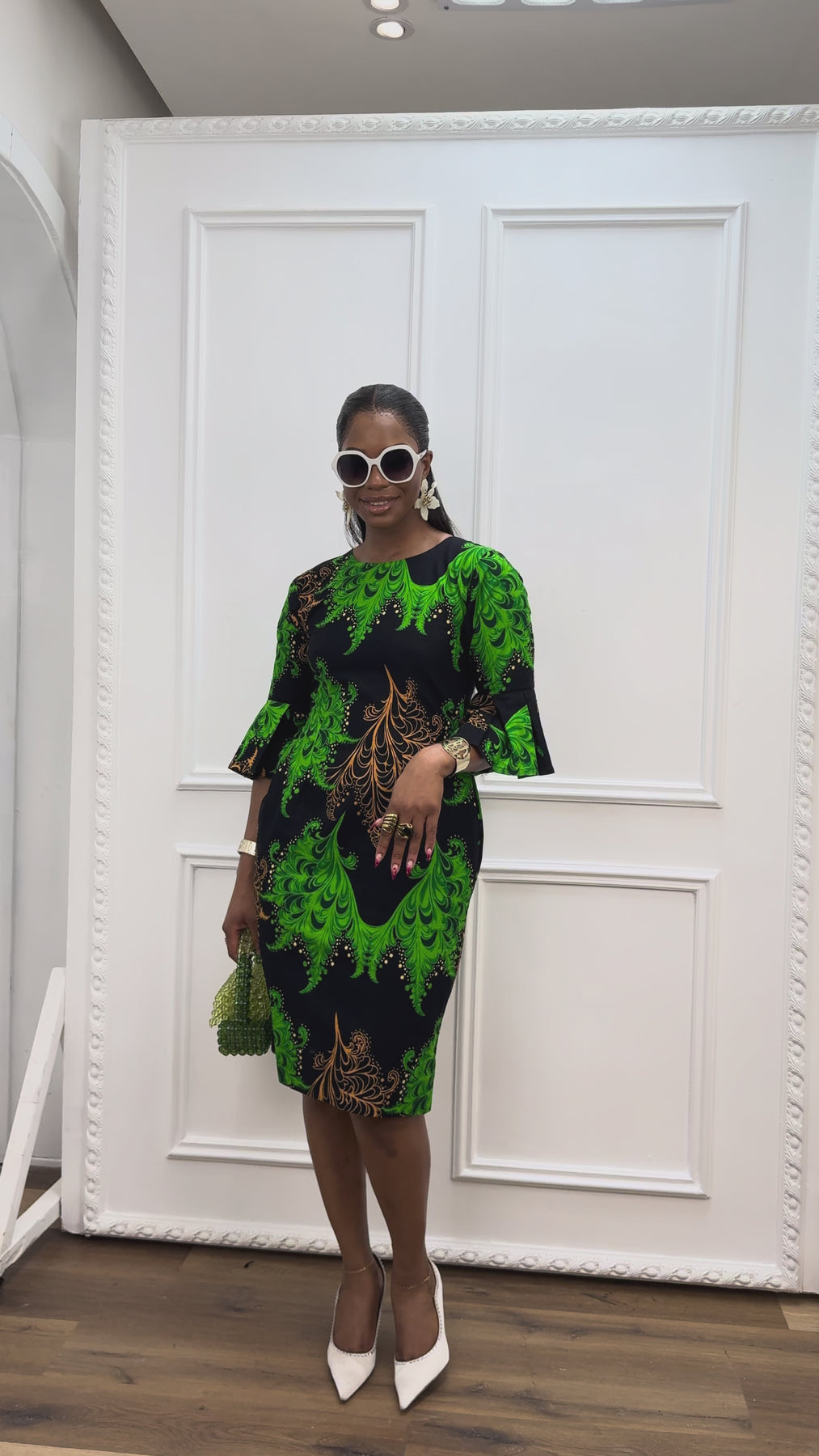 TASSI AFRICAN PRINT BELL SLEEVE MIDI DRESS [GREEN]