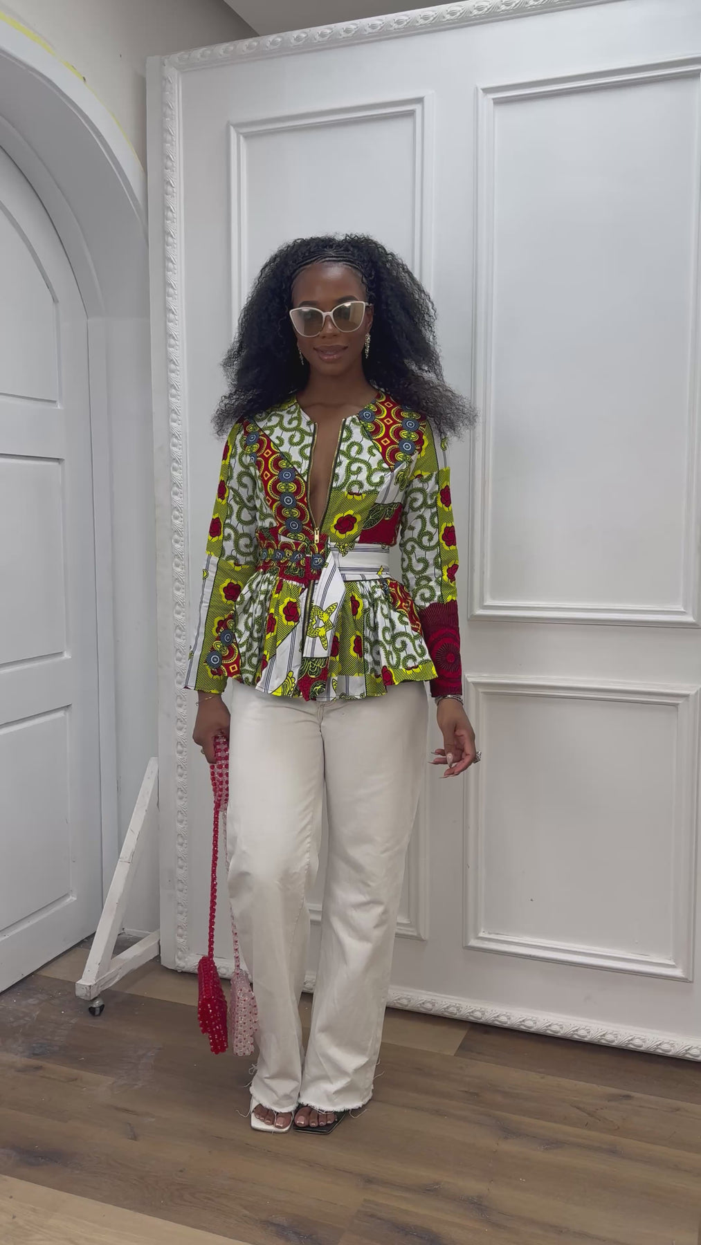 GABRIELLA AFRICAN PRINT FRONT ZIPPER PEPLUM TOP [MULTICOLOR]