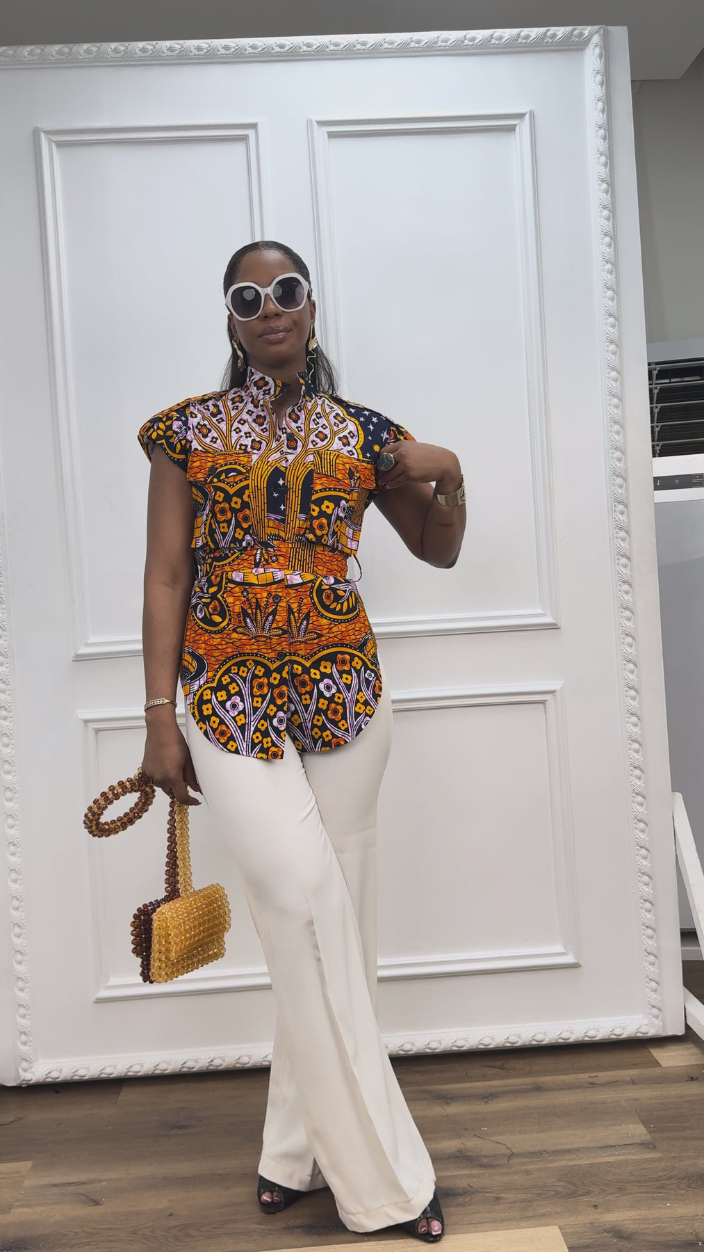 This African print top is an easy statement piece designed to bring polish and personality to your wardrobe. Featuring a structured collar, button-front detail, cap sleeves, and a self-tie waist, it creates a flattering shape while still feeling comfortable. Fully lined for added coverage.